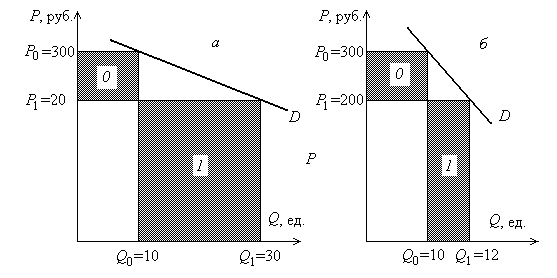 На рис. 1 изображены два варианта графиков спроса. На рис. 1, а снижение цены с Р 0 до Р 1 , на 100 руб. (на 33%) приведет к росту величины спроса с Q 0 до Q 1 , на 20 ед. (на 200%). Коэффициент эластичности будет равен 6 (200:33), т.е. он больше 1, и спрос эластичен. А что произойдет с выручкой от реализации продукции? Она увеличится с 3000 (300×10) до 6000 руб. (200×30), т.е. вырастет в два раза. Заштрихованные прямоугольники 0 и 1 наглядно показывают увеличение выручки от реализации продукции при снижении цены в условиях эластичного спроса. Площадь прямоугольника 1 заметно больше площадипрямоугольника 0.