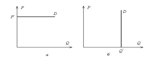 Рис. 2. Крайние случаи эластичности: а — спрос абсолютно эластичен, б — спрос абсолютно неэластичен