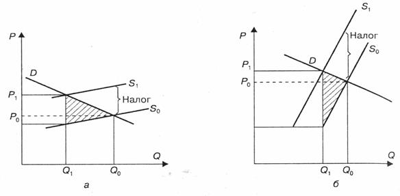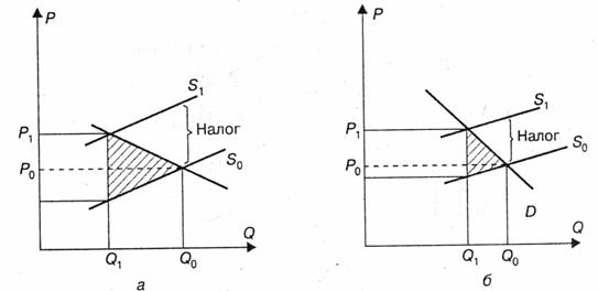 Рис. 6. Распределение налогового бремени при эластичном (а ) и неэластичном (б ) спросе: D — спрос; S 0 , S 1 , — предложение до и после введения налога [Л1, с. 199].