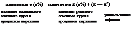 Изменение e в процентном выражении есть изменение реального обменного курса. Изменение Р в процентном выражении — это наш уровень инфляции p , а изменение Р* в процентном выражении — это инфляция в другой стране p* . Таким образом, изменение номинального обменного курса в процентном выражении есть :