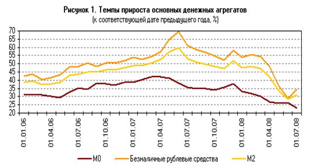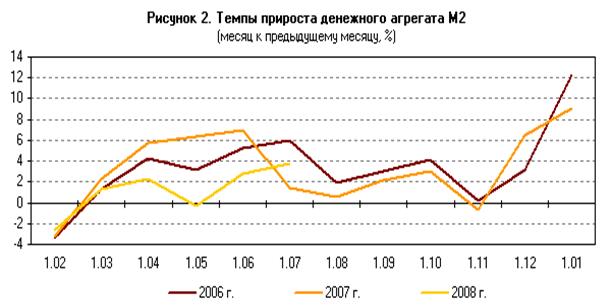 В первом полугодии 2008 г. наблюдалось существенное замедление темпов большинства денежных агрегатов. Денежная масса М2 увеличилась за январь—июнь 2008 г. на 7,3%, тогда как за аналогичный период 2007 г. — на 20,7%. Темпы прироста М2 в годовом выражении также снизились — с 47,5% на 1.01.2008 до 31,2% на 1.07.2008 (53,1% на 1.07.2007). В первом полугодии 2008 г. соотношение темпов роста потребительских цен и денежного агрегата М2 обусловило сокращение рублевой денежной массы в реальном выражении на 1,3% (в первом полугодии 2007 г. она увеличилась на 14,2%).( см.рисунок1)