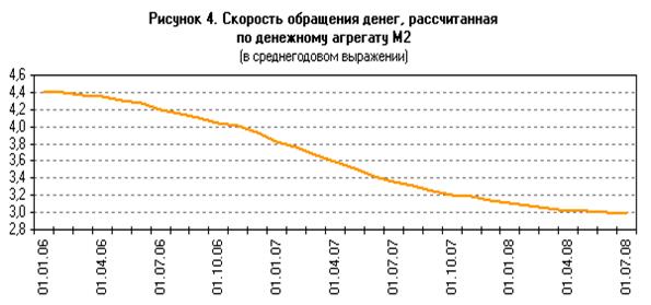 Скорость обращения денег, рассчитанная по денежному агрегату М2 в среднегодовом выражении, снизилась за первое полугодие 2008 г. на 3,0% (за аналогичный период 2007 г. — на 12,2%). Уровень монетизации экономики (по денежному агрегату М2) за январь—июнь 2008 г. увеличился с 32,2 до 33,2%.(см. рисунок4)