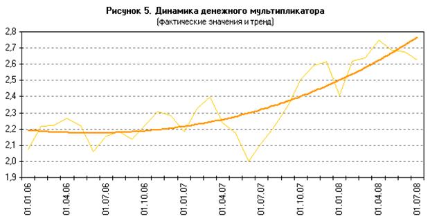 Денежный мультипликатор увеличился с 2,407 на 1.01.2008 до 2,627 на 1.07.2008, или на 9,1% (за первое полугодие 2007 г. — уменьшился на 3,2%).(см. рисунок5)[16]