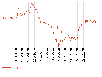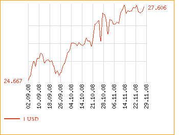 Доллар набирает обороты. Уже за сентябрь-ноябрь 2008 года он вырос с 24,667 до 27,606 рублей (см. рисунок6). Поэтому в ближайшей перспективе если и имеет смысл хранить деньги в банке, то держать их лучше на долларовых вкладах.