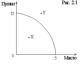 Производство благ в объемах сверх тех, которые заданы кривой производственных возможностей, в точках, расположенных выше кривой (например, Y ), невозможно, т.е. выйти за ее рамки на данном уровне развития производительных сил нельзя.