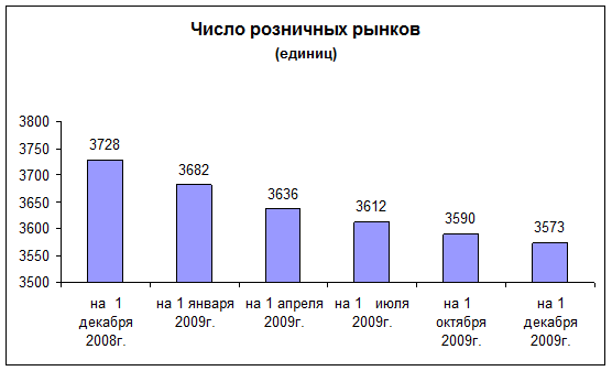 Число рынков в субъектах Российской Федерации сокращалось в основном за счет закрытия (переоборудования) рынков универсального типа. За период с 1 декабря 2008 года по 1 декабря 2009 года их число сократилось на 127 объектов. В качестве положительной тенденции необходимо отметить постепенное увеличение числа сельскохозяйственных рынков: на 1 декабря 2008 года функционировало 178 рынков указанной специализации, на 1 апреля 2009 года – 183, на 1 июля – 187, на 1 сентября – 193, на 1 декабря – 200 рынков. Число сельскохозяйственных кооперативных рынков выросло за этот период с 7 до 13. Вместе с тем, сельскохозяйственные и сельскохозяйственные кооперативные рынки составляют только 6% от общего числа рынков (на 1 декабря 2008г. – 5%).