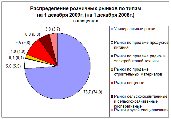 На розничных рынках население покупало в 2009 году более 10% продовольственных товаров, по непродовольственным товарам они формировали около 17% общего объема продажи указанных товаров. По –прежнему велика роль рынков в обеспечении населения мясом и птицей, плодоовощной продукцией, одеждой, обувью, чулочно-носочными изделиями, коврами и ковровыми изделиями. Вместе с тем, удельный вес рынков в общем объеме продажи аудио- и видеоаппаратуры, бытовых электротоваров не превышал 4%.