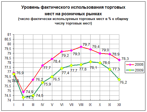 2. Изменения уровня использования торговых мест в течение года носили в основном сезонный характер. Вместе с тем, в 2009 году по сравнению с 2008 годом наблюдалась тенденция снижения уровня использования торговых мест. Его среднегодовой уровень составил 76,7% против 78,2% в 2008 году, причем на сельскохозяйственных кооперативных рынках он снизился с 85,9% до 77,7%, специализированных вещевых рынках – с 82,3% до 77,9%, по продаже радио- и электротоваров – с 77,1% до 72,2%. В то же время на сельскохозяйственных рынках указанный показатель увеличился за год с 67,8% до 68,3%, специализированных рынках по продаже продуктов питания – с 81,0% до 83,5%, по продаже строительных материалов – с 90,5% до 92,7%.