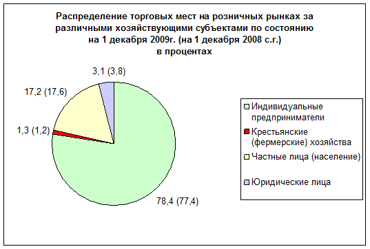 Крестьянским (фермерским) хозяйствам было выделено 12,4 тыс. торговых мест, что на 4% меньше, чем на 1 декабря 2008 года. Но и эти торговые места использовались в среднем по России лишь наполовину (51,4%), а на рынках Республики Хакасия, Забайкальского края, Липецкой, Орловской, Тверской, Тульской, Магаданской областей уровень их фактического использования не превышал 15%. В республиках Коми, Ингушетия, Тыва, Чеченской Республике торговые места крестьянским (фермерским) хозяйствам, как и в 2008 году, не выделялись.