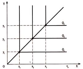 В ситуации с жесткой дополняемостью факторов (рис. 2.7) предельная норма технологического замещения будет равна О ( MRTSx , y = 0). Если мы возьмем современный таксопарк с постоянным количеством машин (у), для работы на которых необходимо определенное количество водителей (x), то можно сказать, что количество обслуживаемых пассажиров в течение суток не увеличится, если мы увеличим численность водительского состава до xv xp ... хп . Объем производимого продукта увеличится с Q{ до Q2 только в том случае, если увеличится количество используемых машин в таксопарке и численность водителей.[10]