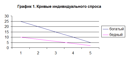 Рыночная цена определяет объем индивидуального спроса. При ее изменении изменяется и спрос. Кривые спроса имеют нисходящий характер, так как каждая последующая единица блага обладает меньшей предельной полезностью и, следовательно. Менее привлекательна для покупателя. Эти же кривые могут объяснить, зачем покупатель обменивает деньги на товары, если они оцениваются как одинаково полезные. Дело в том, что богатый покупатель за 1 единицу блага готов был заплатить 25 ден. ед., а заплатил всего лишь его цену (10 ден. ед.), т.о. его выигрыш составил 15 ден. ед. Общий выигрыш, который получит покупатель, называется излишком потребителя. Он получается всегда, когда цена спроса больше, чем рыночная цена.