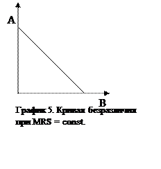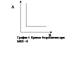Так, на графике 3 мы видим, что предельная норма субституции высока, потребитель предпочитает товар В; на 4-ом предельная норма субституции равна нулю, потребителю безразлично владеет ли он 1 единицей А и одной единицей В, или 1 единицей А и 10 единицами В; на 5-ом предельная норма субституции величина постоянная, товары А и В взаимозаменяемы.