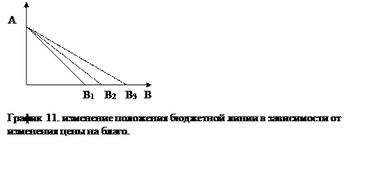 Снижение цены на один из товаров (В) означает, что при неизменном доходе и неизменной цене другого блага (А) сможет больше купить блага В. Таким образам, нижний конец бюджетной линии потребителя при каждом новом снижении цены на благо В будет перемещаться вправо по оси абсцисс.
