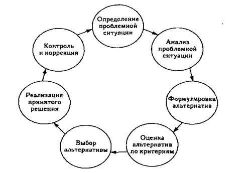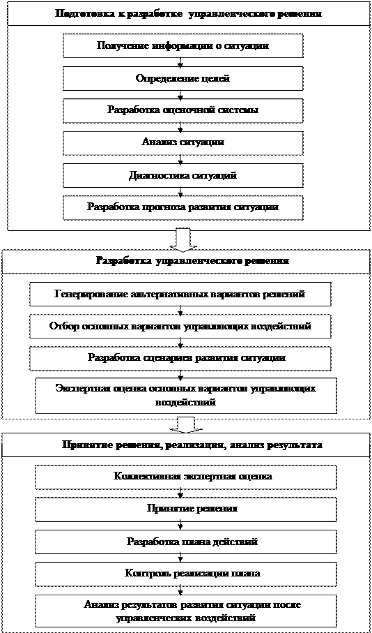 В теории управления существует ряд способов описания стандартного процесса выработки управленческих решений. Все они, однако, различаясь в деталях и по степени детализации, в целом достаточно сходны. И включат следующие этапы [7, с. 136]: