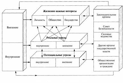 Национальная безопасность - чрезвычайно сложная многоуровневая функциональная система, в которой непрерывно происходят процессы взаимодействия и противоборства жизненно важных интересов личности, общества, государства с угрозами этим интересам, как внутренними, так и внешними. При этом взаимодействии и противоборстве интересы и угрозы постоянно испытывают воздействие со стороны других элементов системы национальной безопасности: факторов внутренней и внешней окружающей среды и действий управляющей системы (схема 1 ). В качестве целевой функции этой системы выступает степень защищенности данных интересов от угроз.