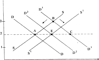 Таким образом, внутренние макроэкономические сдвиги в России и Германии, вызванные международным переливом золота, приведут к возникновению новых кривых спроса и предложения марки. Эти кривые пересекутся, например, в точке Е, расположенной между точками А и С.