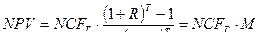 Заменим теперь этот поток разновеликих по годам чистых денежных потоков эквивалентным аннуитетом , то есть последовательностью равновеликих годовых чистых денежных потоков NCFГ , обеспечивающих такую же величину NPV, как и исходная последовательность. При этом NPV для эквивалентного аннуитета определяется по формуле: