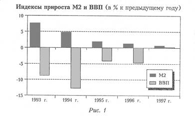 Накопление кризисного потенциала в российской экономике происходило постепенно и параллельно кажущейся стабилизации, давшейся, однако, большой ценой. Борьба с инфляцией путем ограничения роста денежной массы (см. рис. 1) привела к недостатку наличных денежных средств для обслуживания товарооборота: монетизация экономики составила всего 10% против 70–75% ВВП, как во всех развитых странах.