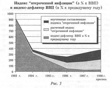 В условиях отсутствия механизмов, обеспечивающих экономический рост, несовершенной фискальной системы, поддержания высокого уровня потребления и интенсивного вывоза капитала за границу "отсроченная инфляция" быстро вытесняла текущую. Так, если в 1993 г. величина "отсроченной инфляции" составляла всего доли процента текущей, то в 1998г. она превышала ее уже в десять раз. В 1995–1996 гг. "отсроченная инфляция" вышла из–под государственного контроля и стала развиваться самопроизвольно (см. рис. 3).