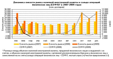 Емкость рынка (суммарный объем наличной иностранной валюты по всем источникам поступления, включая ее остатки в кассах уполномоченных банков на начало периода) в марте 2009 г. по сравнению с февралем снизилась на 6% и составила 18 млрд. долларов. Обороты межбанковского рынка снизились на 11%, обороты операций физических лиц — на 12% — до 3,4 и 13,2 млрд. долларов соответственно.