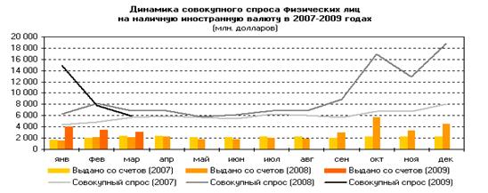 В марте 2009 г. совокупный спрос населения на наличную иностранную валюту (сумма купленной в обменных пунктах, полученной по конверсии и снятой с валютных счетов наличной иностранной валюты) по сравнению с февралем уменьшился на 24% и составил около 6 млрд. долларов. Его объем превысил совокупный спрос в марте 2007 г. на 5%, но был ниже его уровня в марте 2008 г. на 14%.
