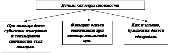 Деньги выступают мерой стоимости. Общество считает удобным использовать денежную единицу в качестве масштаба для соизмерения относительных стоимостей разнообразных благ и ресурсов. Благодаря денежной системе нам не надо выражать цену каждого продукта через все другие продукты, на которые он мог бы быть обменен; мы не должны выражать стоимость скота через зерно, цветные карандаши, сигары, автомобили и т.д.