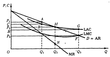 Но, как мы знаем, выпуск Q1 «слишком мал», а цена P1 «слишком высока». Заметим, что наиболее целесообразным для общества был бы выпуск Q3 и цена р3, на что монополист не пойдет. Поэтому регулирующий орган должен бы установить на продукцию этой монополии цену Р3 = LMC(Qз) = AR(Q3). Проблема в том, что такая цена не возместила бы затрат на производство продукции, она оказалась бы ниже средних затрат при объеме производства Q3, рз < LАС (Qз) = GQ3 = ОН. В итоге монополист, производящий оптимальный с точки зрения общества объем продукции Q3, получал бы отрицательную прибыль (убыток), равную площади P3HGF . Чтобы монополия не покинула рынок, необходимо было бы предоставить ей дотацию в размере, по крайней мере равном той же величине P3HGF. Но, как мы знаем, предоставление дотаций может привести, хотя и не обязательно, к чистым потерям для общества.
