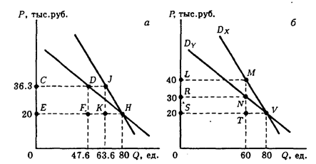 Вычислим теперь потери в эффективности, вызванные таким решением. В отношении продукта У такие потери измеряются треугольником FDH, а в отношении продукта Х — треугольником KJH, т. е. соответственно 264 тыс. руб. и 133 тыс. руб., что в сумме составляет 397 тыс. руб.
