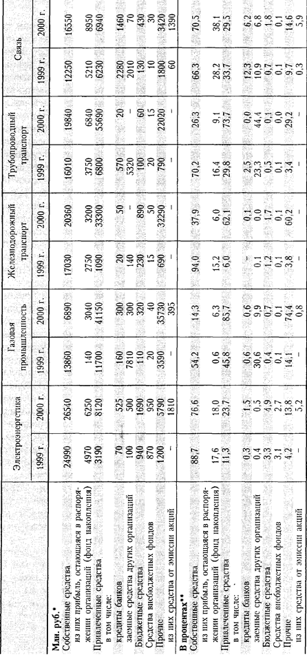 Объем привлеченных средств увеличился из-за резкого роста прочих источников. В 2000 г. прочие привлеченные средства составили (в среднем по пяти отраслям) 41,7% всех источников финансирования инвестиций в основные фонды (против 7,1% в 1999 г.). Особенно велики объемы прочих источников в газовой промышленности и на железнодорожном транспорте. В последней отрасли огромные средства централизуются в фонде министерства, а затем направляются на конкретные предприятия для приобретения и создания основных фондов. Предприятия показывают эти источники в статистической отчетности как "прочие". Нечто подобное происходит, по-видимому, и в системе ОАО "Газпром", который значительную часть основных фондов перевел на баланс головной организации и предоставляет их в аренду дочерним и зависимым организациям. Как видим, изменившаяся в 2000 г. структура источников финансирования инвестиций в основные фонды свидетельствует главным образом о развитии процессов централизации и перераспределения средств внутри систем взаимозависимых организаций. Впрочем, в
