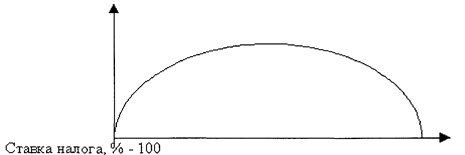 Кривая характеризует зависимость суммы налоговых поступлений в бюджет от динамики ставки налога на прибыль. При низких ставках поступления в бюджет возрастают с увеличением процента налога, хотя прирост доходов и понижается. При определенной ставке доход оказывается на максимально предельном уровне. Дальше при увеличении ставки поступления в бюджет уменьшаются. Это связано с тем, что высоких налогах снижается прибыльность производства, дестимулируются инвестиции. Выпуск продукции сокращается, падает масса прибыли и даже при повышенном проценте налоговые бюджетные поступления сокращаются.