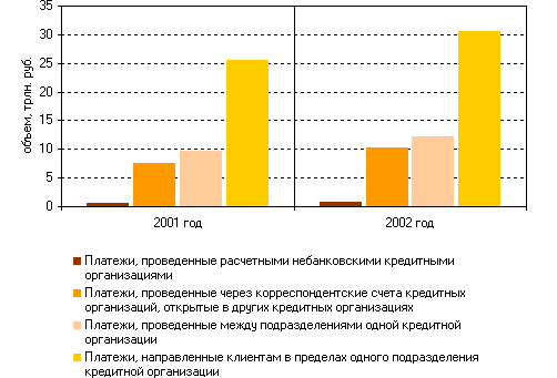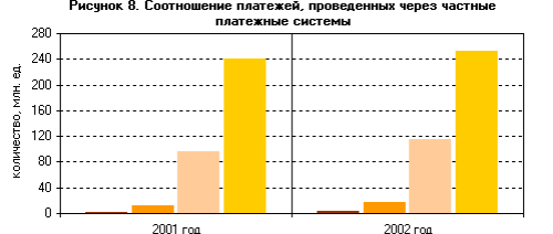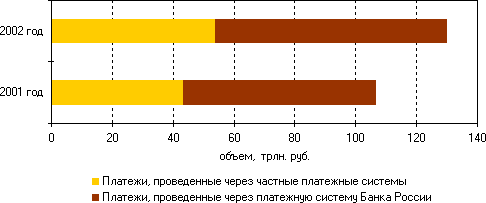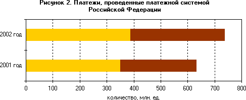 Участниками платежной системы России являлись (данные на 01.01.2003) 1172 учреждения Банка России, 1331 кредитная организация, в том числе 41 расчетная небанковская кредитная организация, 3326 филиалов кредитных организаций. Кроме того, расчетное обслуживание клиентов осуществляли 6387 дополнительных офисов кредитных организаций. Участниками платежной системы России открыто клиентам (резидентам и нерезидентам) 271,4 млн. банковских счетов в валюте Российской Федерации, в том числе юридическим лицам, не являющимся кредитными организациями, - 4,2 млн. счетов (1,6%), физическим лицам - 267,2 млн. счетов (98,4%), из которых большинство счетов - 90,1% - в Сберегательном банке Российской Федерации. Количество банковских счетов в расчете на одного жителя в среднем по России составило 1,9 счета. Участниками платежной системы России открыто клиентам (резидентам и нерезидентам) 271,4 млн. банковских счетов в валюте Российской Федерации, в том числе юридическим лицам, не являющимся кредитными организациями, - 4,2 млн. счетов (1,6%), физическим лицам - 267,2 млн. счетов (98,4%), из которых большинство счетов - 90,1% - в Сберегательном банке Российской Федерации. Количество банковских счетов в расчете на одного жителя в среднем по России составило 1,9 счета. В среднем по Российской Федерации количество жителей, приходящихся на одного участника платежной системы России, составило 24,7 тысячи человек, а количество юридических лиц - 660. В то же время, с учетом дополнительных офисов, открытых кредитными организациями (филиалами), данные показатели соответственно составили 11,8 тысяч жителей и 315 юридических лиц. В 2002 году платежной системой России проведено 737,9 миллионов платежей на сумму 130,1 трлн. рублей. Увеличение по сравнению с 2001 годом объема платежей составило 22,0%, что выше уровня инфляции в стране. Это, а также количественный рост платежей на 16,5%, явилось следствием подъема деловой активности хозяйствующих субъектов. В 2002 году практически не изменилось соотношение безналичных платежей, проведенных платежной системой Банка России и частными платежными системами в платежной системе страны (рисунок 2).