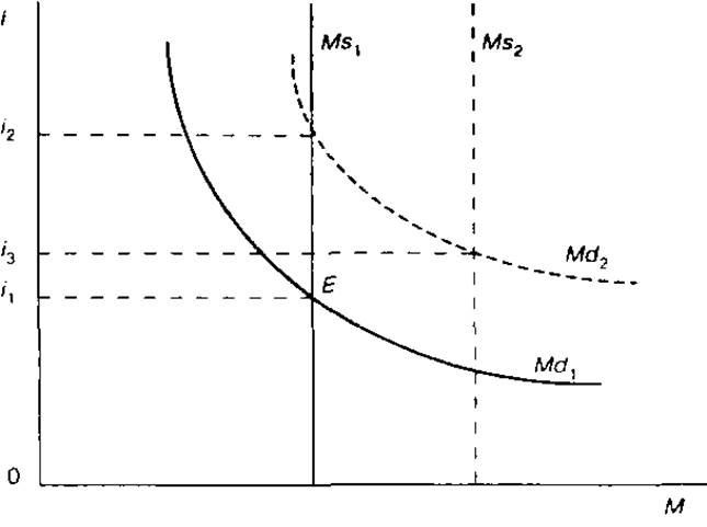 Увеличение предложения денег сдвинет кривую Ms1 вправо, в положение Ms2 ;, и соответственно понизит равновесную процентную ставку до значения (i3 ).