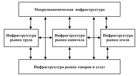 Рыночная инфраструктура - это совокупность организационно-правовых форм, различных институтов, организаций, обслуживающих различные рынки и рыночную экономику в целом и обеспечивающих их функционирование. Во всём сложном и взаимосвязанном комплексе рыночной инфраструктуры можно выделить инфраструктуру рынка труда, рынка капитала, рынка земли, рынка товаров и услуг, а также макроэкономическую инфраструктуру. [5 с. 58]