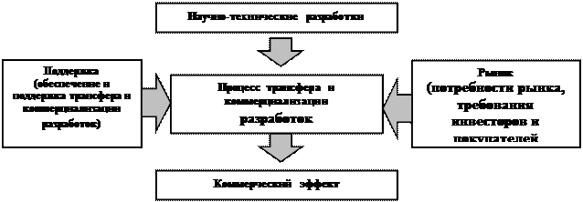 Коммерциализация имеющегося научно-технического задела (научно-технических разработок) на рынке технологий включает в себя как собственно процесс трансфера и коммерциализации научно-технических разработок во взаимодействии с потребностями и требованиями рынка, так и учет компонентов поддержки, способствующих этому процессу и получению коммерческого эффекта (рисунок 3).