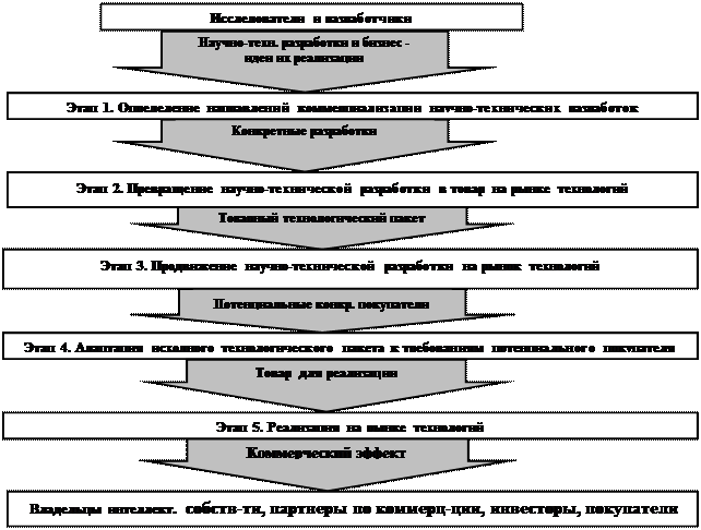 1. превращение научно-технических разработок в товар на рынке технологий;