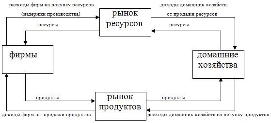 Модель, во-первых, представляет экономический кругооборот, так как имеет место круговое движение реальных экономических благ - ресурсов и продуктов (линии против часовой стрелки), сопровождаемое встречным движением денежных потоков - расходов и доходов фирм и домохозяйств (линии по часовой стрелке). Во-вторых, модель показывает, что именно функционирование рынков дает импульс этому движению, так как именно там формируется цена продуктов и ресурсов, которые в силу этого становятся товарами.
