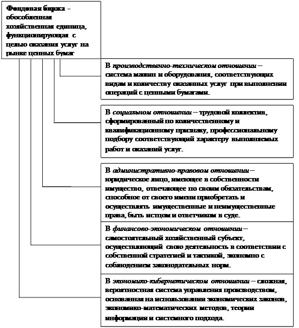 Фондовая биржа как участница экономических процессов, происходящих в национальной экономике страны, может быть представлена производственно-техническим, социальным, административно-правовым и экономико-кибернетическим единством (Схема №2).