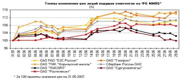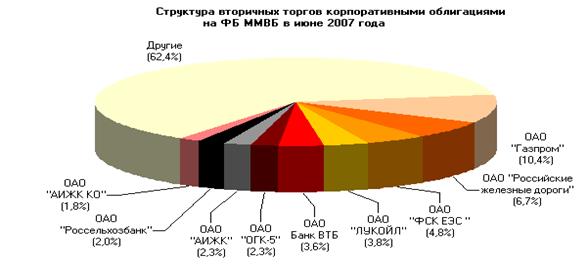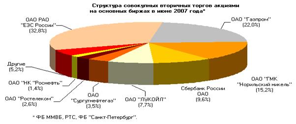 В структуре совокупных вторичных торгов на трех основных российских фондовых биржах (ФБ ММВБ, РТС, ФБ "Санкт-Петербург") в июне набор высоколиквидных бумаг оставался ограниченным: на долю акций 7 ведущих эмитентов (ОАО РАО "ЕЭС России", ОАО "Газпром", ОАО "ГМК "Норильский никель", Сбербанк России ОАО, ОАО "ЛУКОЙЛ", ОАО "Сургутнефтегаз", ОАО "Ростелеком") приходилось 93,4% суммарного торгового оборота.