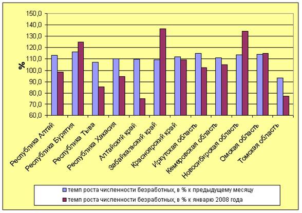 Рис.1. Темп роста численности официально зарегистрированных безработных в январе 2009 года по регионам Сибирского федерального округа