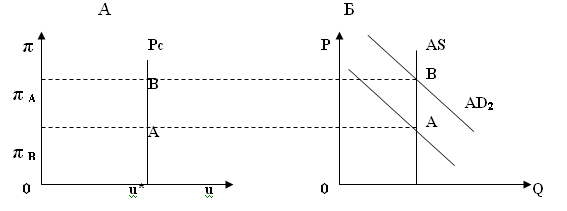 На рисунке 1 представлена кривая Филлипса (Pc), которая показывает, что, например, в точке А высокому уровню безработицы uA соответствует низкий темп инфляции πА . Точка В, наоборот, характеризуется низким уровнем безработицы uВ в сочетании с высоким темпом инфляции π В .