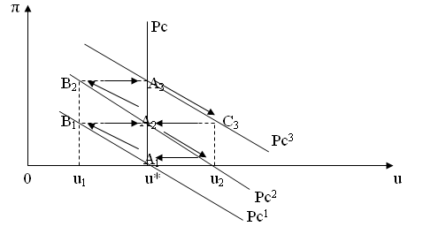 Если государство с помощью мер бюджетно-налоговой или денежно-кредитной политики попытается снизить безработицу до уровня u1, то произойдет движение из точки А1 в точку В1 на краткосрочной кривой Филлипса Pc1 , так как действительный темп инфляции увеличится. Когда действительный темп инфляции выше, чем ожидаемый, безработица сокращается (и наоборот).