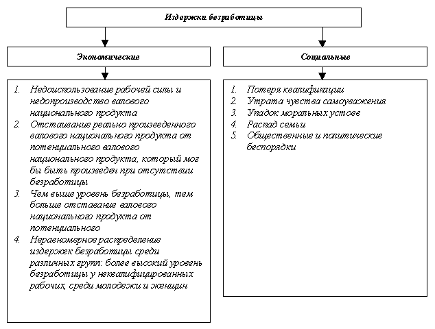 Безработица влечет за собой расточение в огромных масштабах его главной производительной силы – рабочей силы, существенное сокращение потенциального валового продукта и национального дохода страны, значительные производительные расходы государства (или, точнее, средств налогоплательщиков) на выплату пособий по безработице, переквалификацию безработных и их трудоустройство. Очевидно, что при неполном использовании имеющихся ресурсов рабочей силы экономическая система работает, не достигая границ своих производственных возможностей, и ни о каком подъеме экономики в стране не может быть и речи.