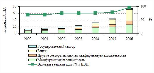 Национального Банка, составлявшего на конец 2006 года около 2,9 млрд. долларов США, приходится менее 3,9% от общего объема валового внешнего долга. Доля краткосрочного долга в структуре долговых обязательств резидентов Казахстана составляла 15,8% по итогам 2006 года в сравнении с 18,6% в 2005 году (график 6).