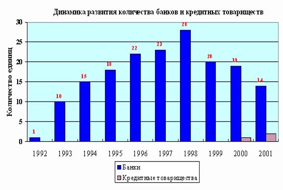 Табличный материал наглядно показывает динамику сокращения общего количества банков второго уровня в республике, так если в 1993 году количество банков составляло 204 единицы, то 2002 году их количество сократилось до 38 единиц.
