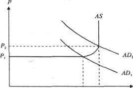 Увеличение спроса приведет к сдвигу кривой спроса вправо из положения AD1 в положение AD2 . Цена в этом случае увеличится со значения Р1 до Р2 . Если экономика находится на промежуточном или классическом отрезке кривой совокупного предложения AS, то это вызывает инфляцию вследствие роста цен.