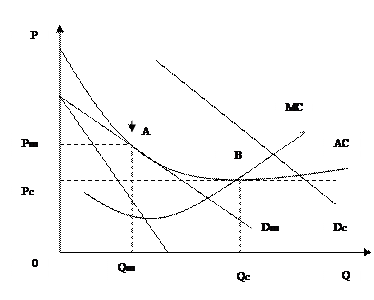 Избыточные мощности и являются платой за монопольную власть, полученной фирмой на основе дифференциации продукта. Как уже отмечалось, чем больше дифференцирован товар, тем выше угол наклона кривой спроса, а значит все дальше влево сдвигается объем производства от оптимального размера, который возможен в точке минимальных средних издержек (Qc). С другой стороны, чем сильнее дифференциация экономических благ, тем в большей мере рынок способен удовлетворить многообразные интересы и вкусы потребителей. В таком случае есть основание утверждать, что с точки зрения общества в целом конкурентная структура обладает и некоторым преимуществом.
