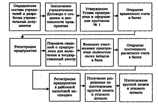 На начальном этапе создания нового предприятия определяется состав учредителей, и разрабатываются учредительные документы: Устав предприятия и Договор о создании и деятельности предприятия с указанием его организационно-правовой формы. Наряду с этим оформляется протокол № 1 собрания участников общества о назначении директора и председателя ревизионной комиссии. Затем открывается временный счет в банке, куда в течение 30 дней после регистрации предприятия должно поступить не менее 50% уставного капитала. Далее предприятие регистрируется по месту своего учреждения в местном органе власти. Для государственной регистрации в соответствующий орган представляются следующие документы: