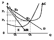 Установление фирмой цены на уровне точки Е2 было бы, очевидно, альтруизмом. В этой точке МС = АС = Р. Но при этом МС > MR . Рационально действующая фирма отнюдь не сочтет нормальным такое положение, когда расширение производства во имя «общественных интересов» будет сопровождаться для нее большими дополнительными затратами, чем дополнительным доходом.