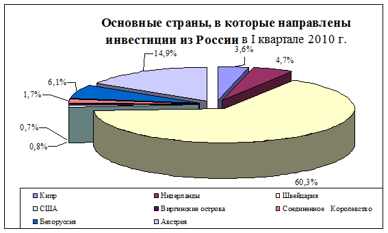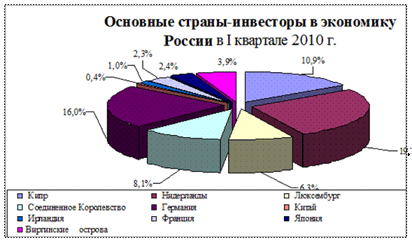 Наибольший рост наблюдается в секторе портфельных инвестиций (в 2,5 раза) за счет вложений в долговые ценные бумаги (рост в 5,7 раз). Прямые инвестиции сократились на 17,6% к уровню I квартала 2009 года. В наибольшей степени сократились инвестиций в лизинговые операции – до 58,6% от уровня I квартала прошлого года, а также взносы в капитал – до 80,8%. Прочие инвестиции в Россию возросли на 17,1%, в том числе торговые кредиты – на 31,1%, прочие кредиты на срок до 180 дней – в 4,3 раза, при сокращении кредитов на срок свыше 180 дней – на 24,9 процента.