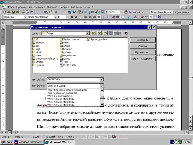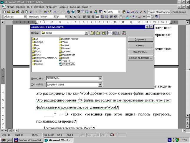 Вы можете сохранить свой документ на любом диске и в любой папке дисковой системы. Можно также сохранять документ в файлах различного формата, что даст возможность другим программам открывать файлы с вашими документами и работать с ними, как если бы это были их собственные документы.